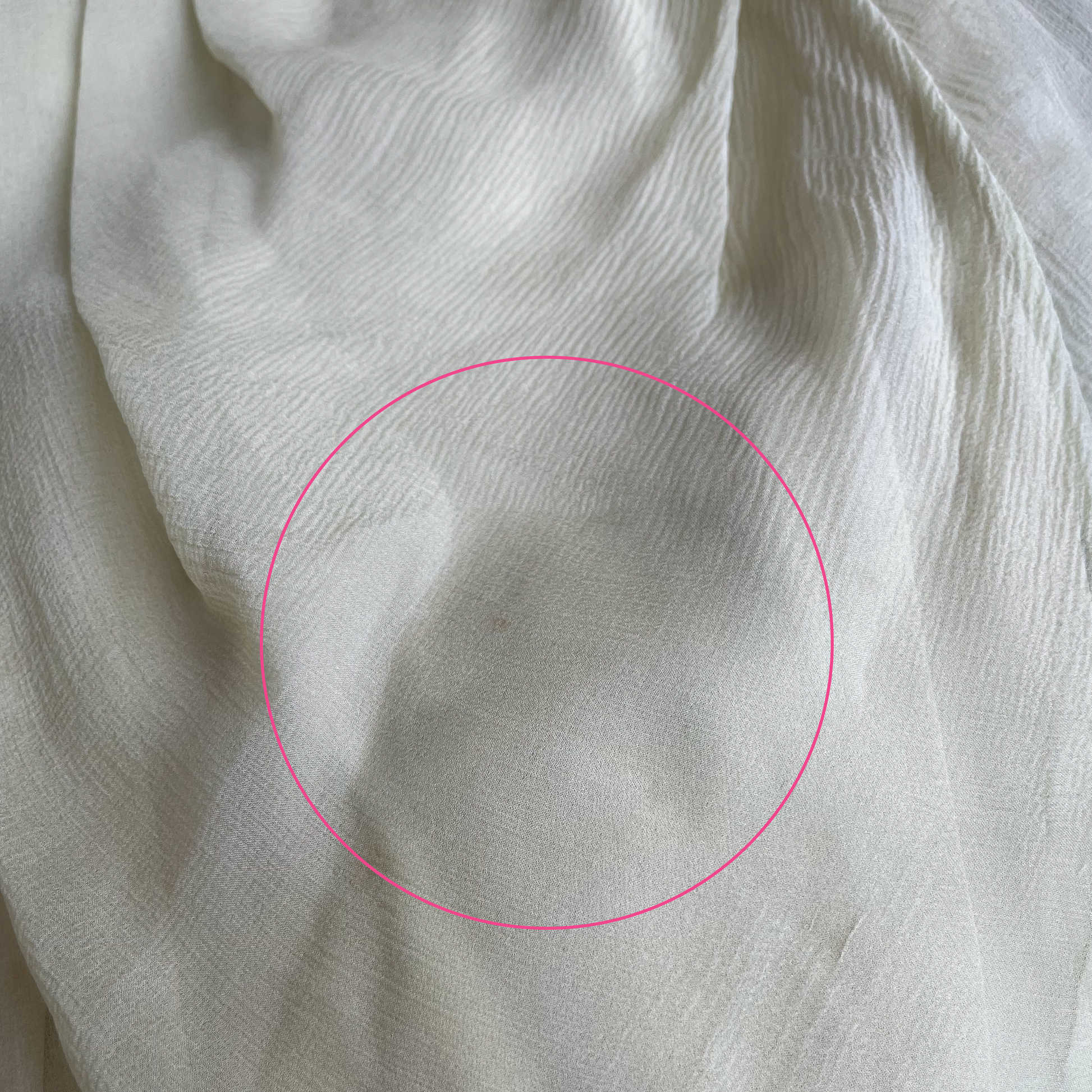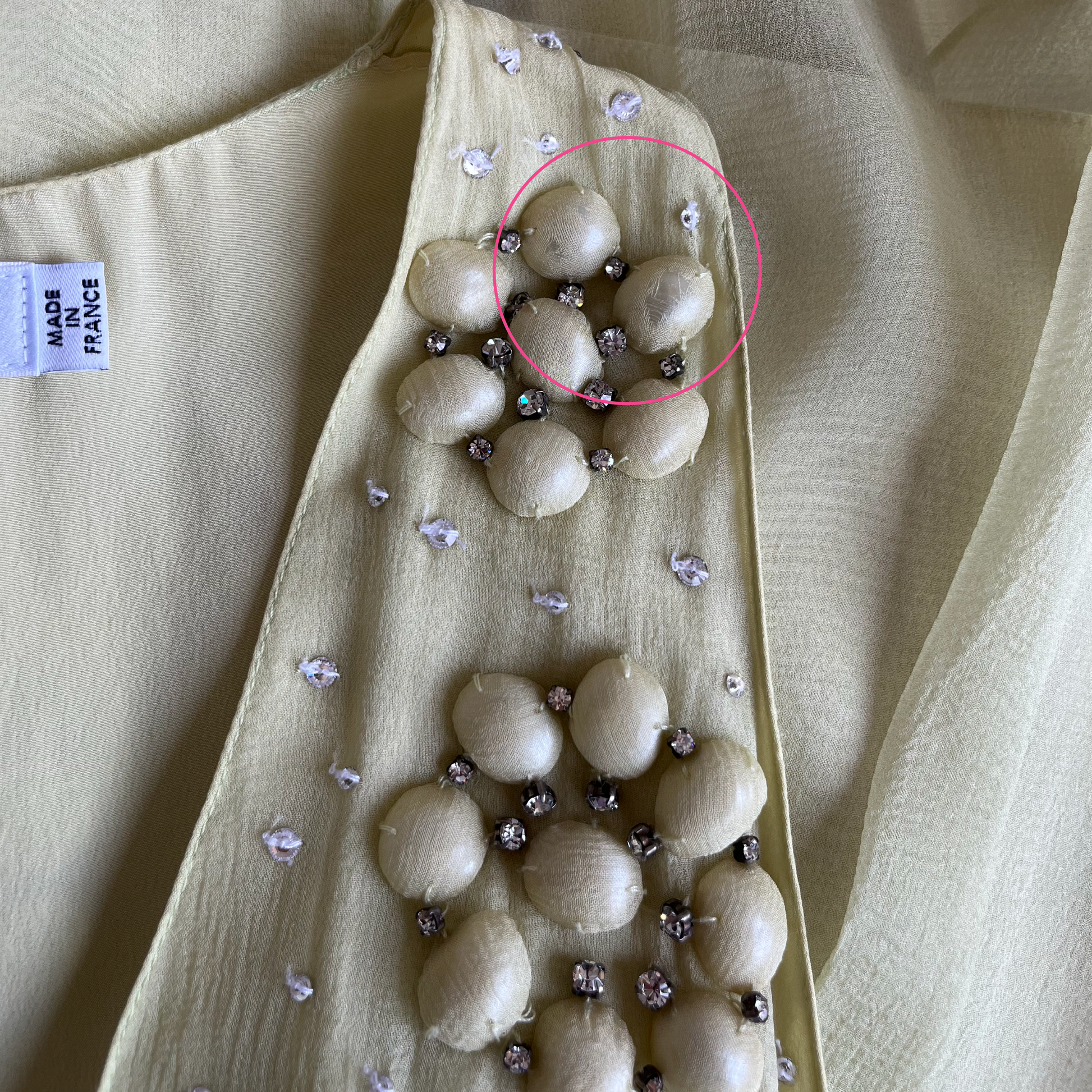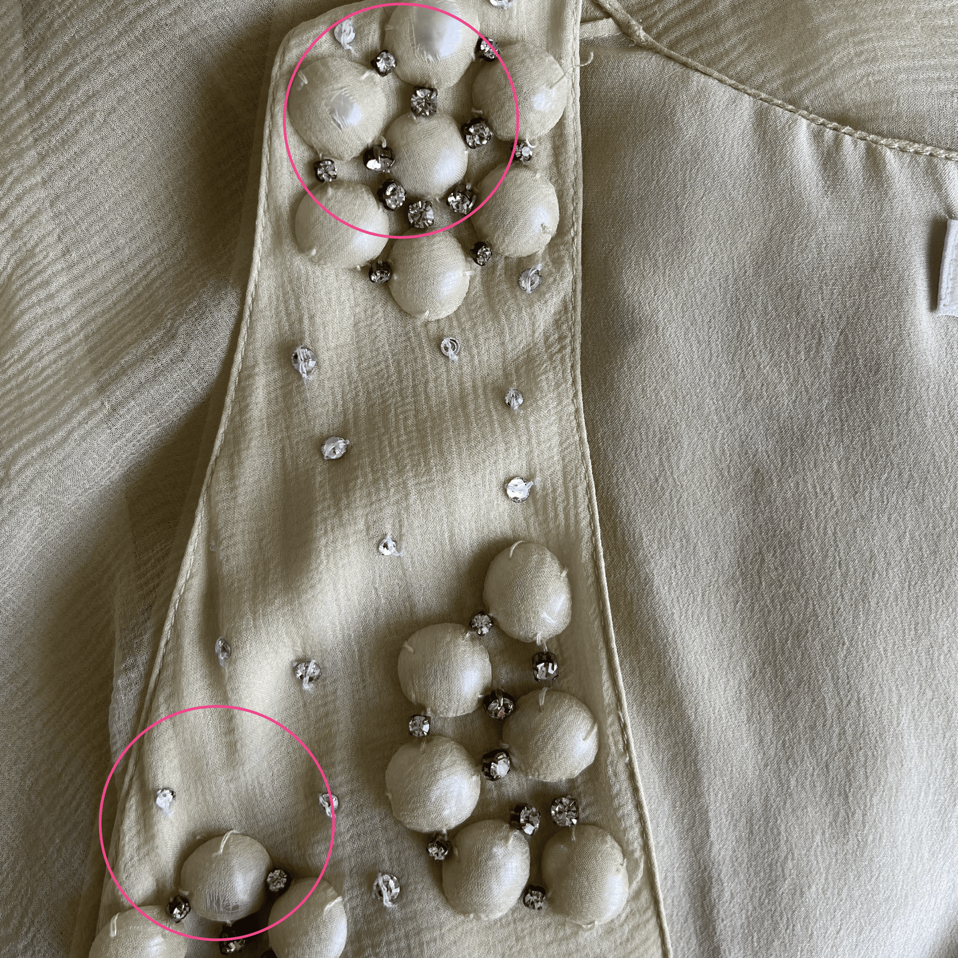 As shown in the final photos, there are three small tears in the silk fabric encasing the pearl embellishments, and a light stain near the hem
