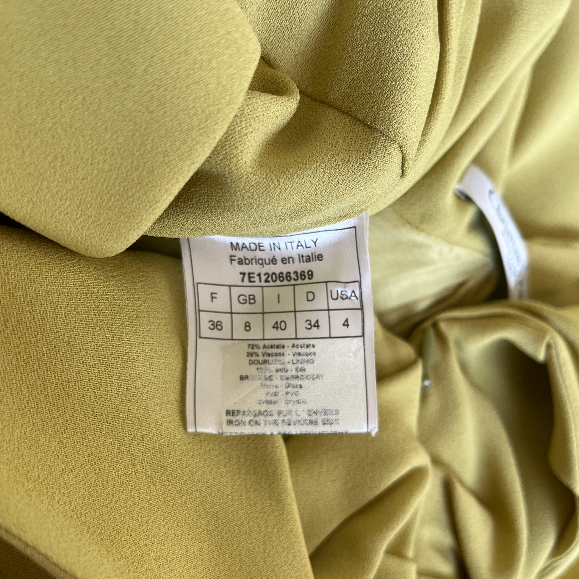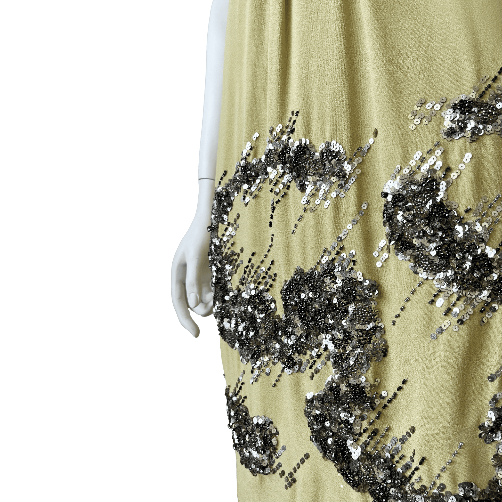 A beautifully draped SS 2007 Dior by Galliano dress in a soft chartreuse tone, finished with intricate sequin embroidery along the hem