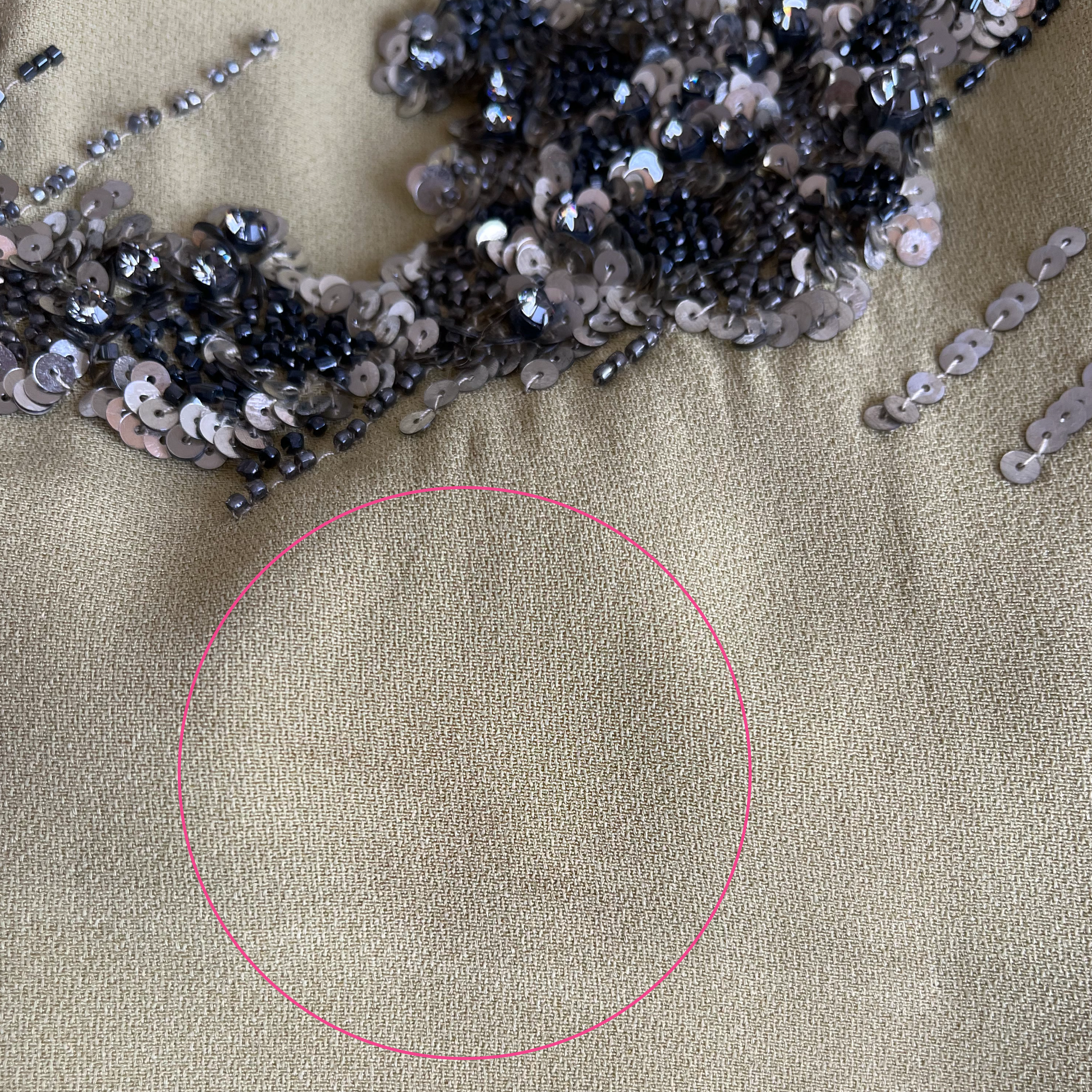 There is a stain where indicated in the last photo — a dry cleaner should be able to remove it