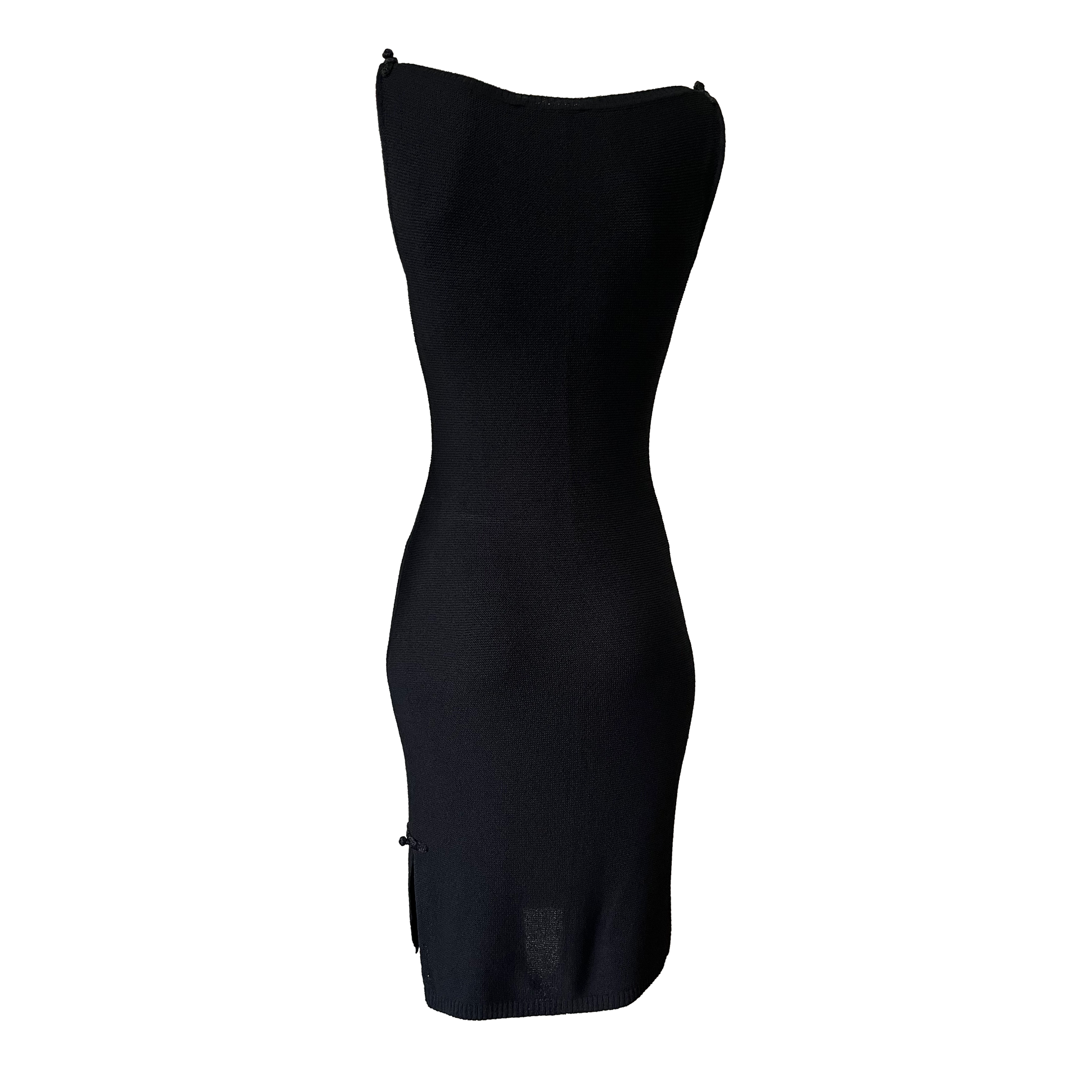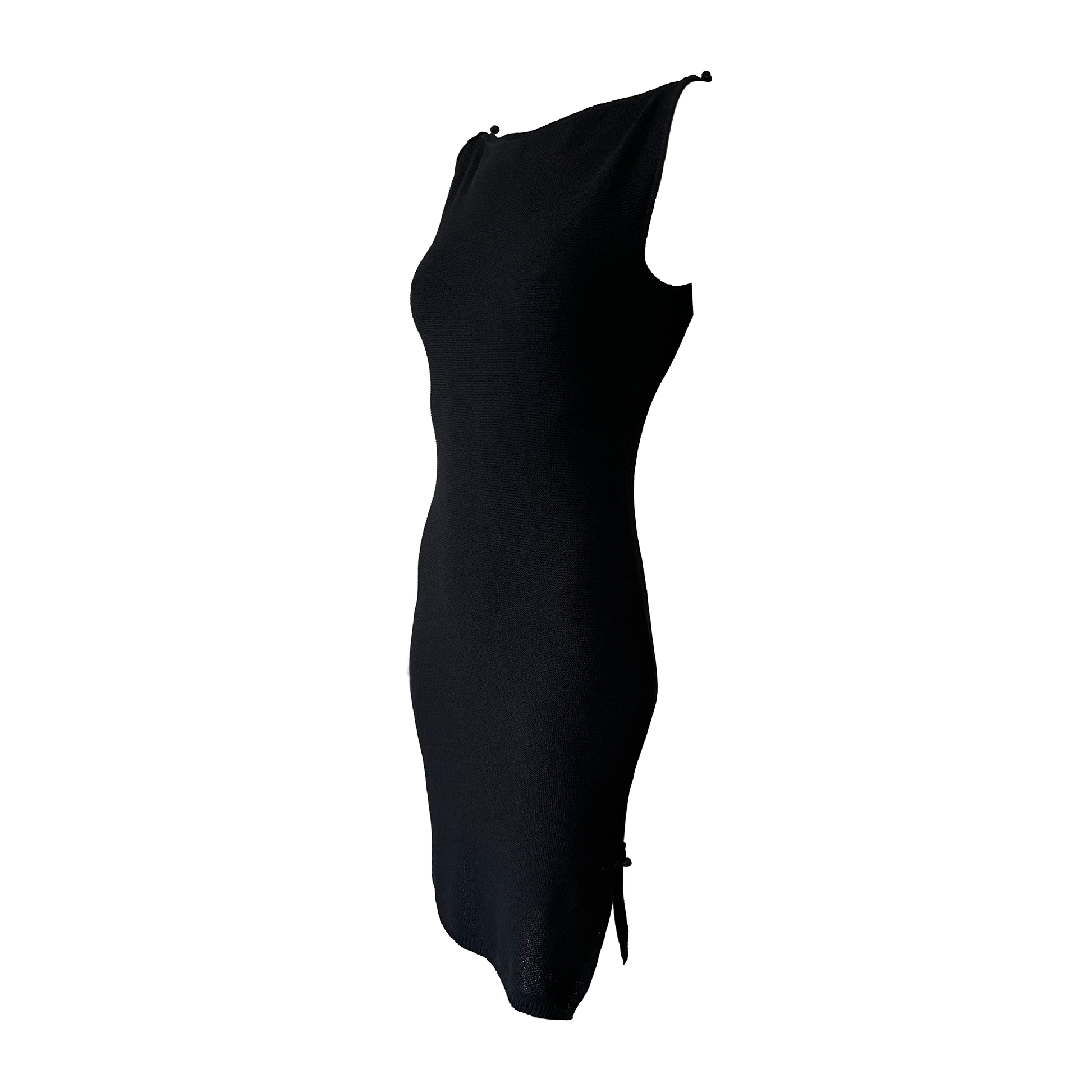 Minimal, body-skimming silhouette in a textured black knit with SS 1999 signature knotted details at the shoulders and slit