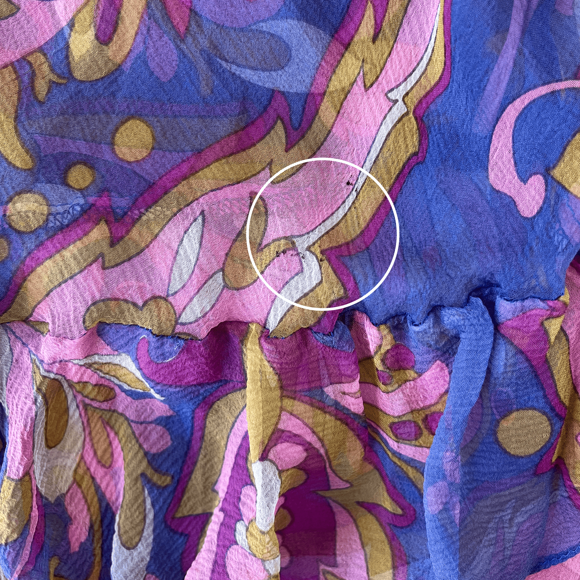 Crafted in Italy from 100% silk, the dress flows with layered transparency in tones of violet, fuchsia, and gold, reminiscent of Mediterranean summers and cinematic glamour.