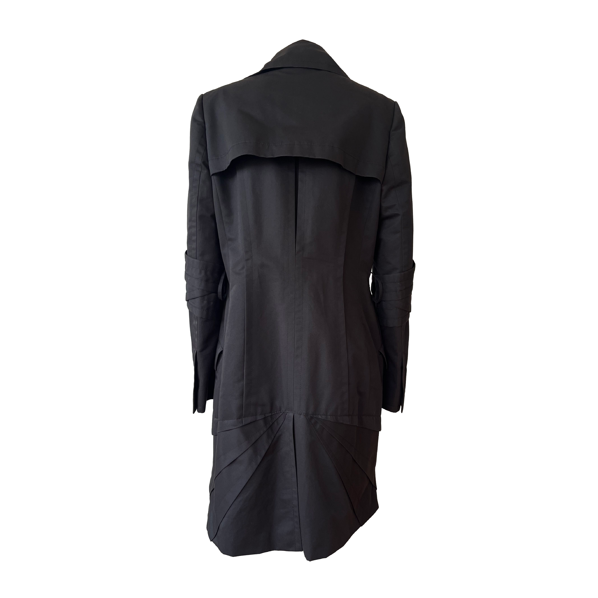 Constructed in Italy from a structured cotton–polyester blend, the coat sculpts the body with architectural precision.