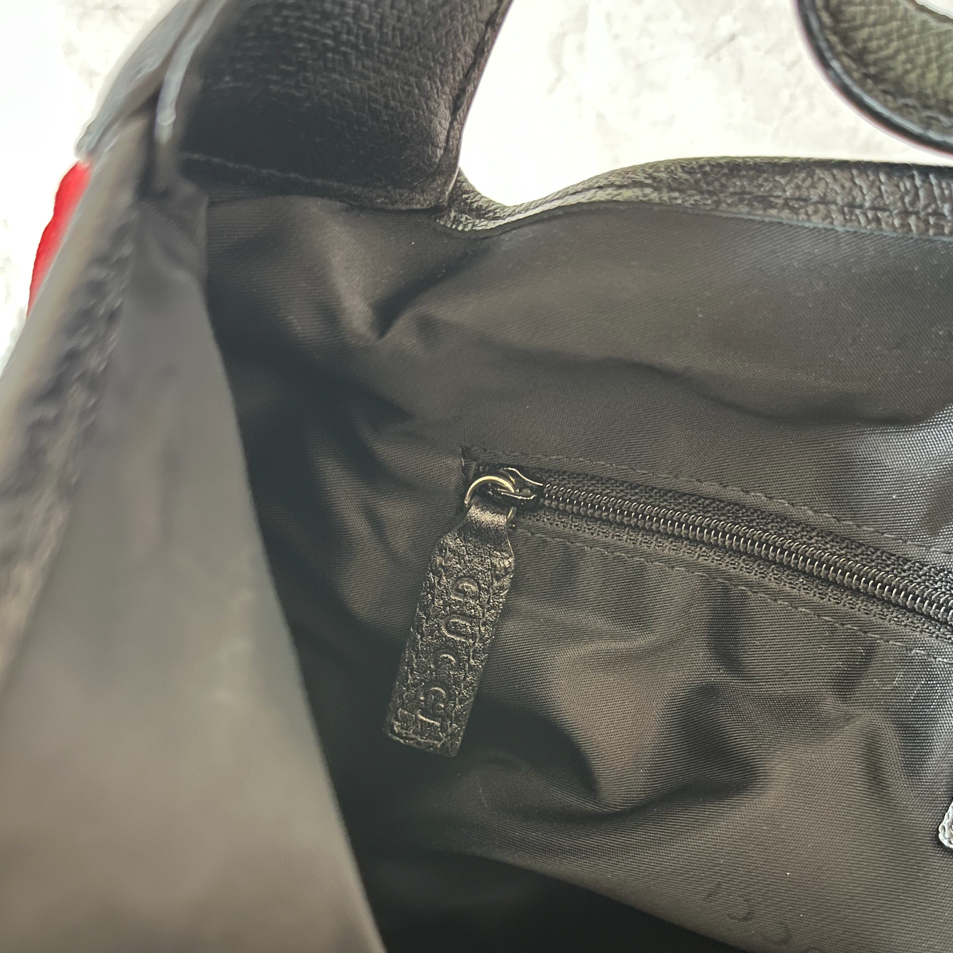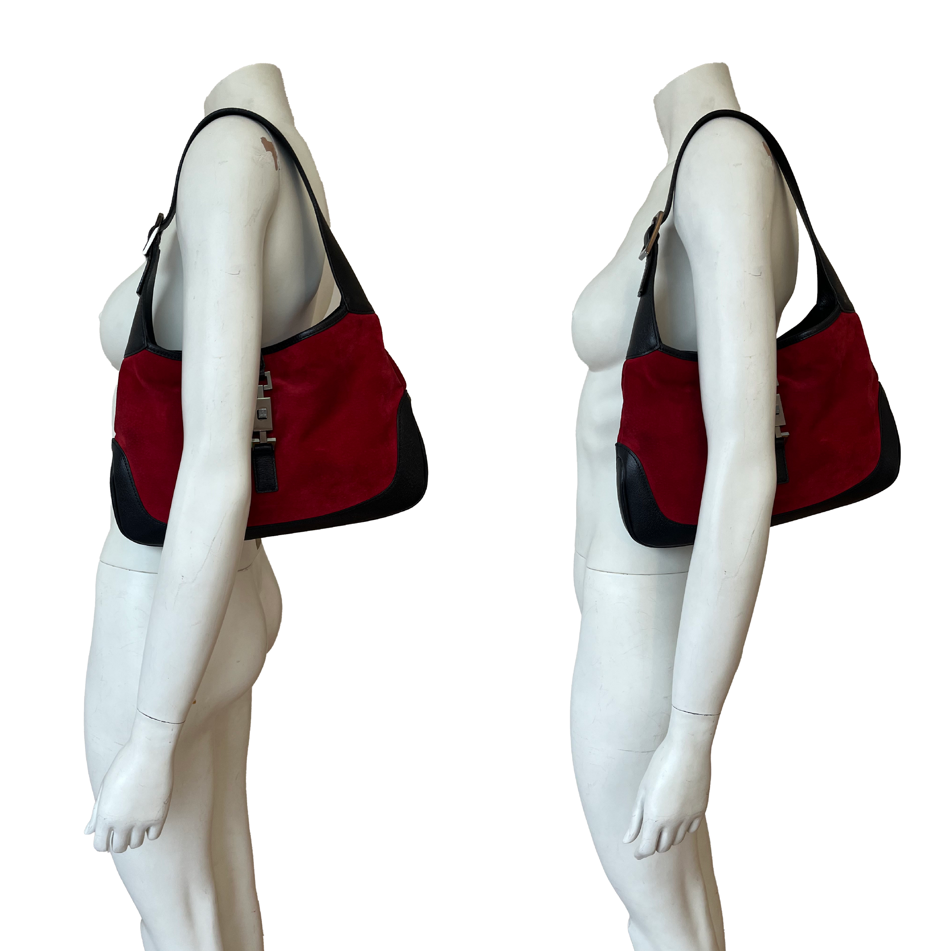 A rare and collectible Gucci shoulder bag from the Tom Ford era, featuring a luxurious red suede body combined with smooth black leather trim