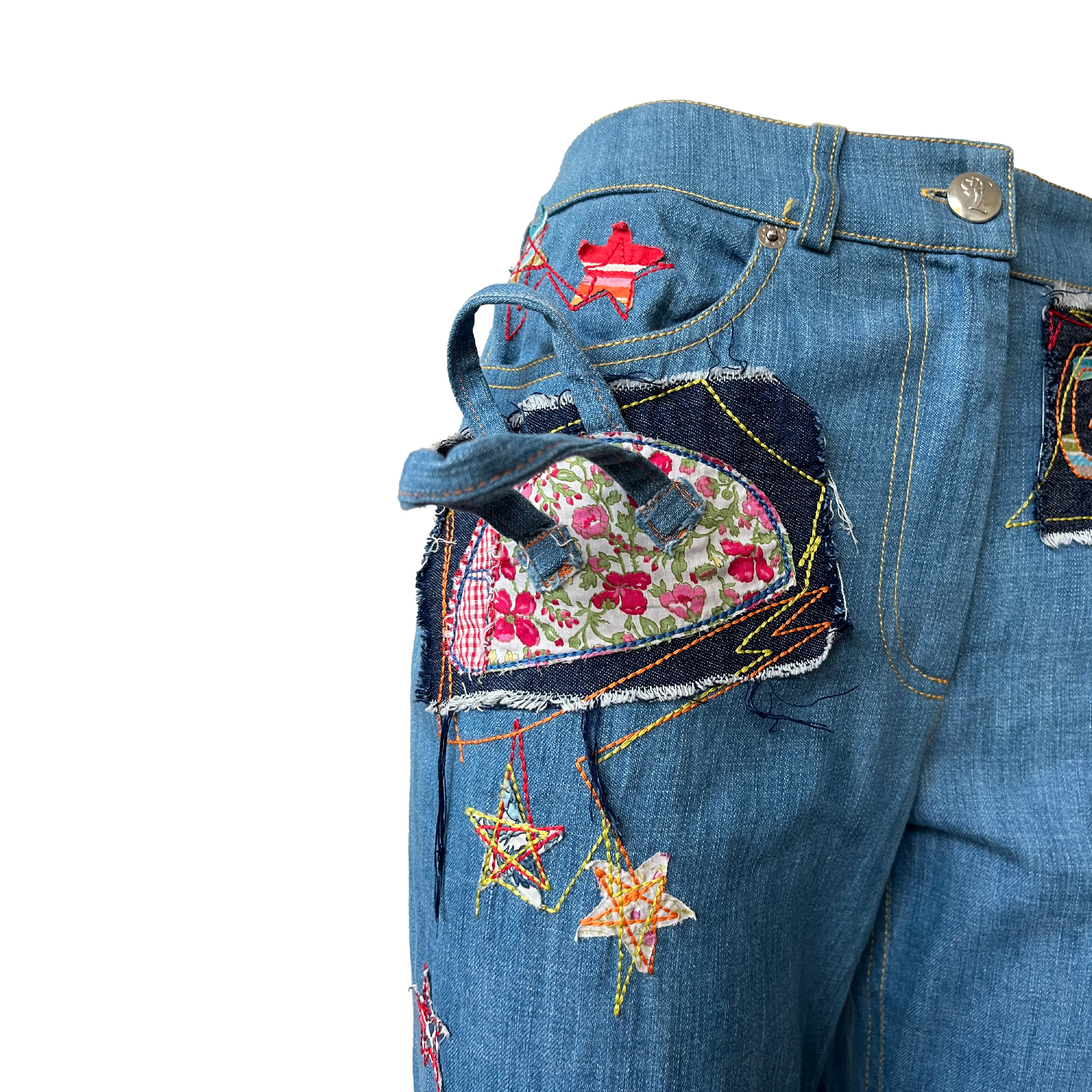 Constructed from 100% cotton denim, the piece is richly adorned with appliqué patches, multicolored embroidery, star motifs, and whimsical 3D details such as a lace-up boot patch and mini bag appliqué.