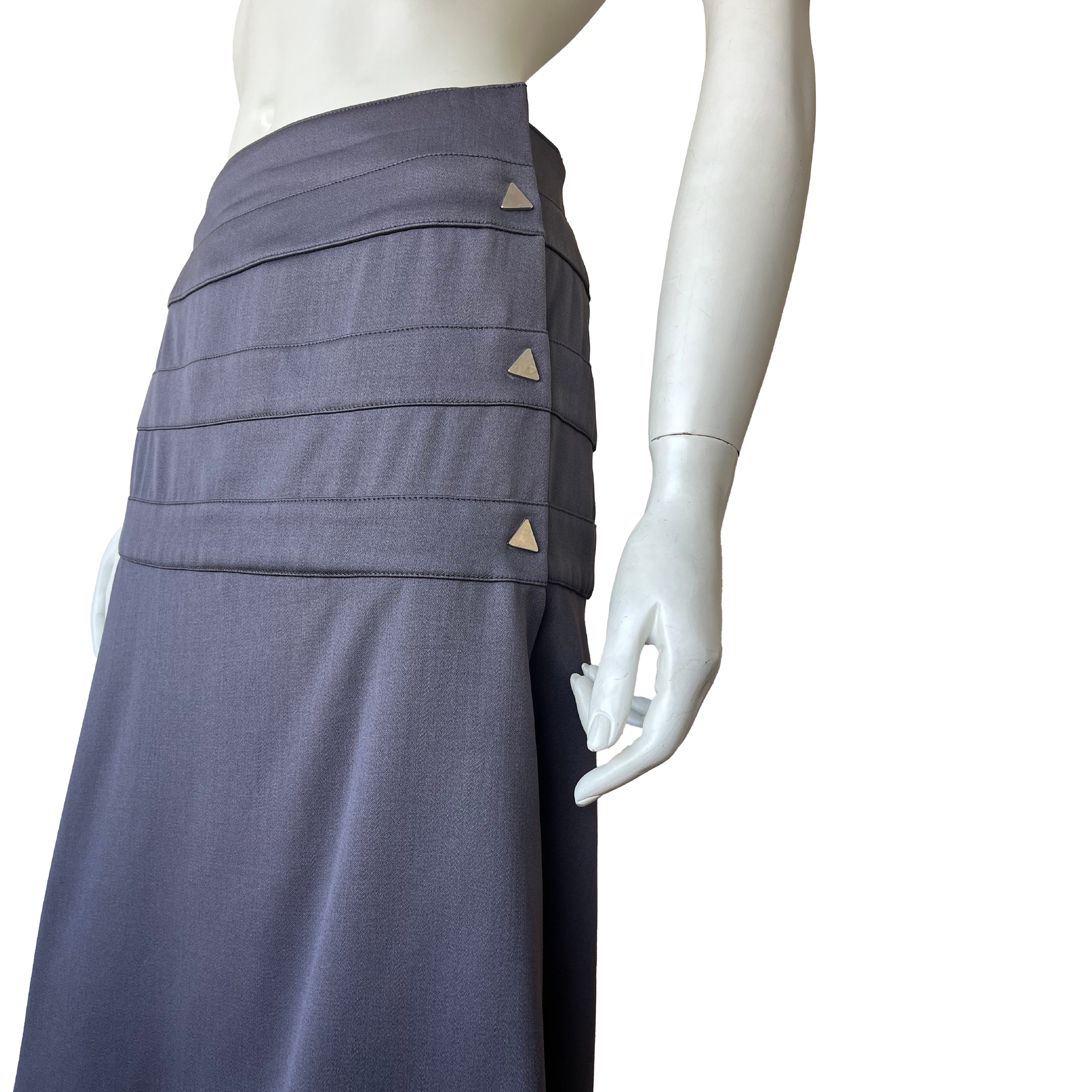 Layered waist panels and signature triangle hardware create a sharp, structured look, while the asymmetrical drape gives beautiful movement when worn